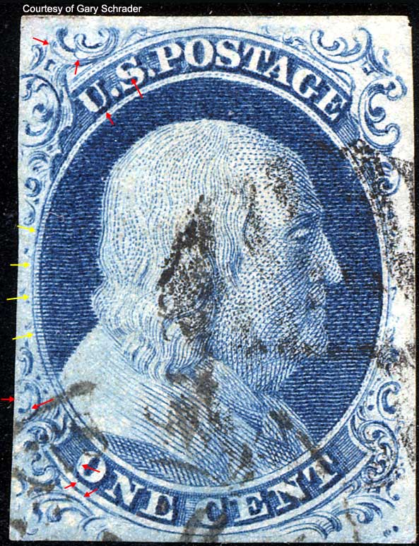 | Scott #9 Blue, Type IV, Relief B Issued both imperforate and perforated. Perforated copies are more scarce. SINGLE RECUT TOPand BOTTOM |