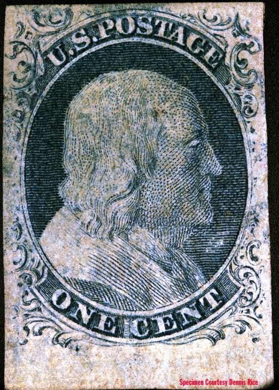 | Scott #9 Blue, Type IV, Relief B Issued both imperforate and perforated. Perforated copies are more scarce. SINGLE RECUT TOP ONLY 83L, 84L, 85L, 93L, 94L 96L and 99L are outstanding examples of what is sometimes called the rusty plate variety. These marks show themselves as small patches of needle point dots. This variety was, according to Ashbrook, no doubt caused by small patches of dampness left on the plate, which corroded the polished steel surface. |