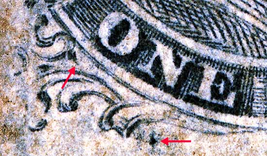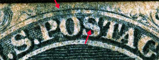 | Figure 1. (Below) Upper red arrow shows the top recut curved line dipping slightly between the "P" and "O" of POSTAGE. The lower red arrow indicates the prominent rust/pitting marks in the "S."