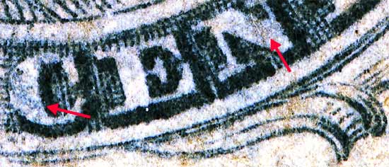 | Figure 3. (Below) Rust / pitting marks in the "C" and "N" of CENTS.