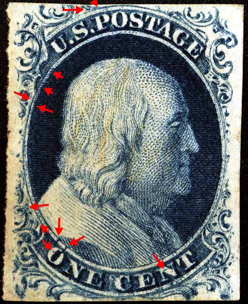 | Scott #9 Blue, Type IV, Relief B Issued both imperforate and perforated. Perforated copys are more scarce.Relief B SINGLE RECUT TOP ONLY Another IMPRESSION can been seen here. |