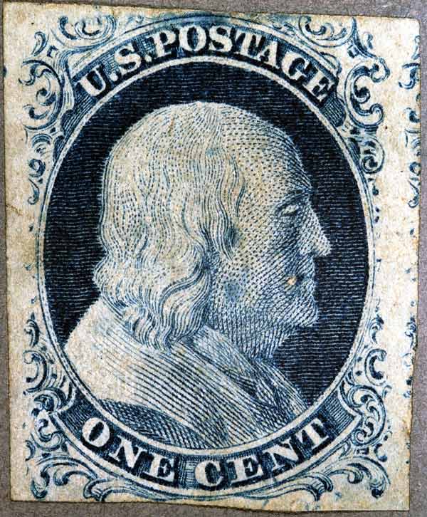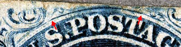 | Scott #9 Blue, Type IV, Relief B Issued both imperforate and perforated. Perforated copies are more scarce. SINGLE RECUT TOP ONLY 83L, 84L, 85L, 93L, 94L 96L and 99L are outstanding examples of what is sometimes called the rusty plate variety. These marks show themselves as small patches of needle point dots. This variety was, according to Ashbrook, no doubt caused by small patches of dampness left on the plate, which corroded the polished steel surface. |