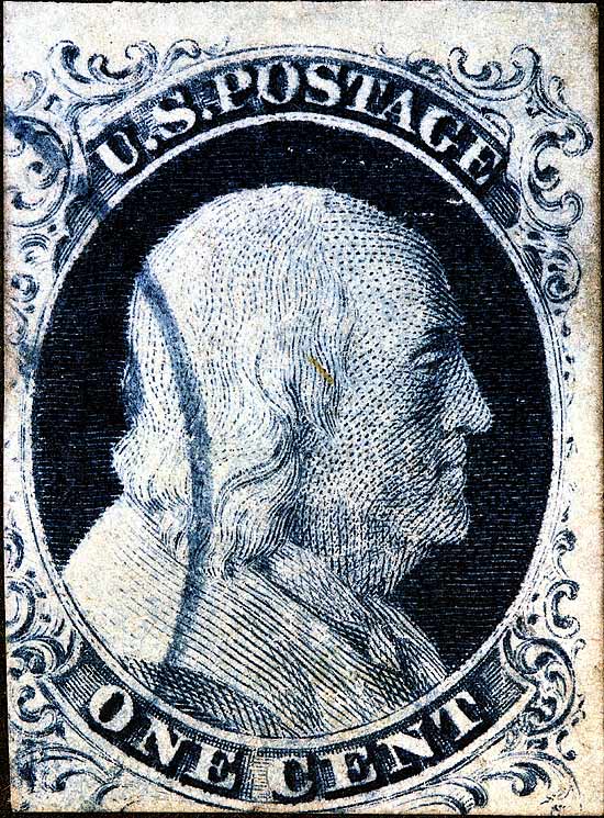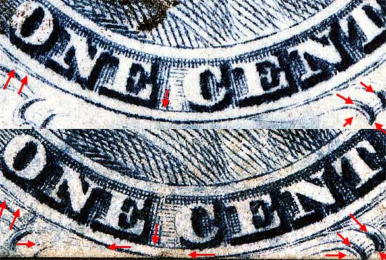 1¢ Franklin Issue of 1851-1857, PLATE 1 LATE. Pos 10R1L, (Scott #9) |