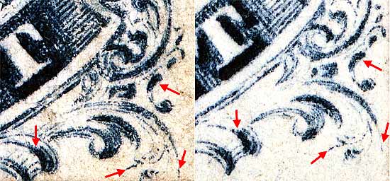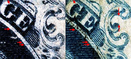| Figure 3. (Below) Detail view of numerous faint horizontal scratches found on this position. Early impressions also show a fine vertical line inside of Ornament "L."