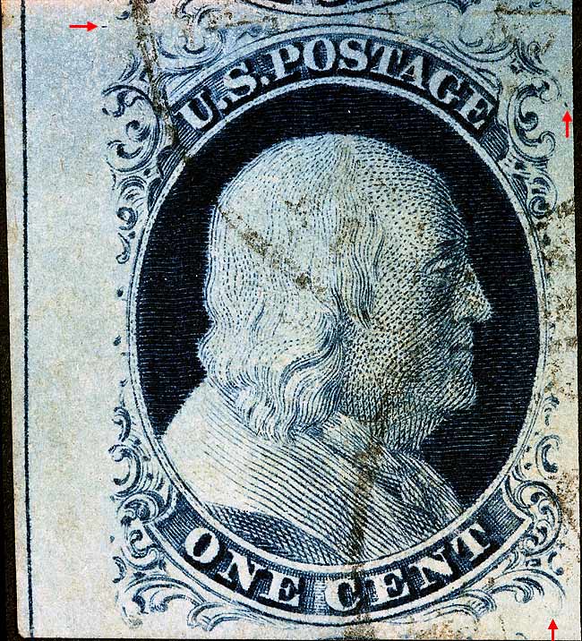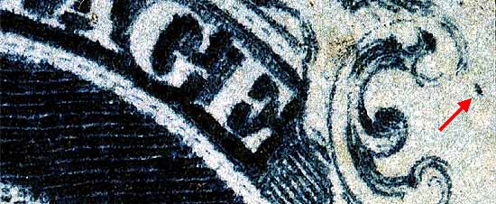 | Scott #9 Blue, Type IV, Relief A Issued both imperforate and perforated. Perforated copies are more scarce. SINGLE RECUT TOP Position 11R1L below showing the pane centerline at left. |