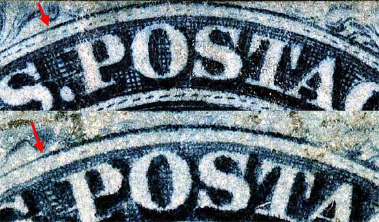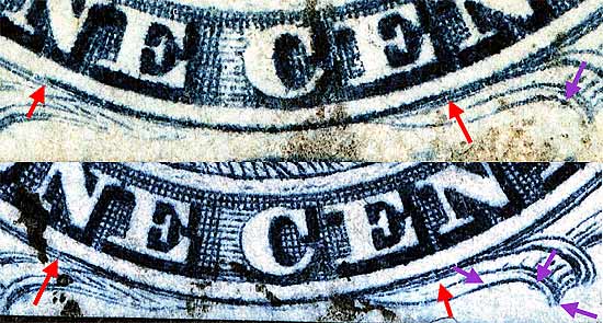 | Figure 3. (Below) Detail view of bottom RECUT LINE. The lower image shows a faint plate scratch below the RIGHT SCROLL. Both images show a mark which is the remains of the right SCROLL BALL. Many positions show this feature. (See violet arrows)