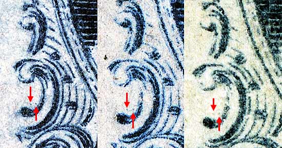 | Figure 1. (Below) During the course of preparing images for the Archive, the author found these 2 small dots, inside and above Ornament "G." The Ashbrook plating diagrams do not show any other definitive plating marks at this position. It is hoped that other students of this issue can verify these as consistent. Also note that the inner arc of Ornament "F/G" is slightly doubled and appears to fade away as the plate wears.