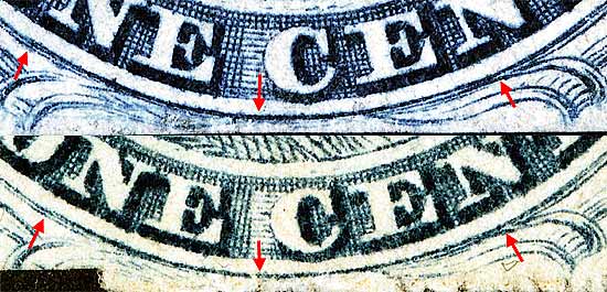 | Figure 2. (Below). Detail of the bottom recut line on 2 impressions. The left and right arrows are the approximate starting and stopping points of the recut per Ashbrook's plating diagrams.