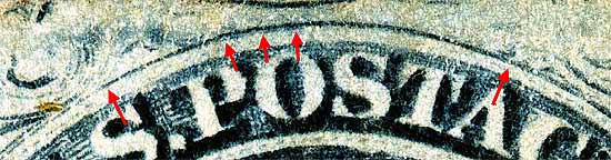 | Figure 3. (Below) (Below) Detail view of TOP RECUT line. Note that the recut line is slightly doubled over the "P and O" of POSTAGE.