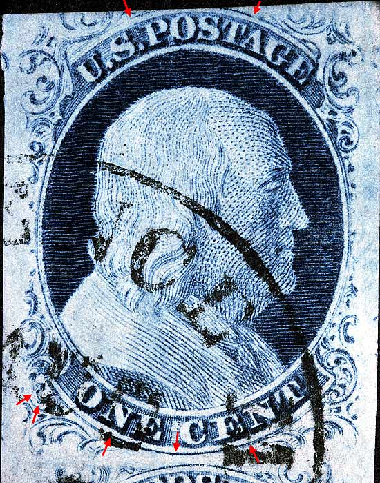 | Scott #9 Blue, Type IV, Relief A Issued both imperforate and perforated. Perforated copies are more scarce. SINGLE RECUT TOP Part of a vertical pair cinsisting of 17R1L and 27R1L. Note that Ornament "S" is weakly impressed. This is not indicated on the Ashbrook plating diagrams. Ashbrook indicates a diagonal dash of color above the "E" of CENT. This copy is a poor impression and the dash does not reveal itself. |