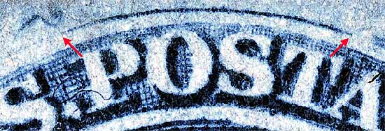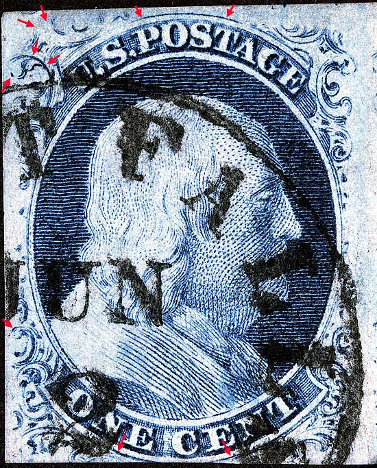 | Scott #9 Blue, Type IV, Relief A Issued both imperforate and perforated. Perforated copies are more scarce. SINGLE RECUT TOP Note that Ornament "S" is weakly impressed. This is not indicated on the Ashbrook plating diagrams. Plating marks of note are indicated below until a better impression is obtained. |