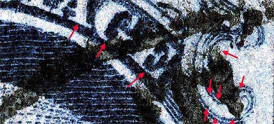 | Figure 1. (Below) Detail view of the top recut line. Note that the recut appears to flatten out above the "O and S" of POSTAGE.