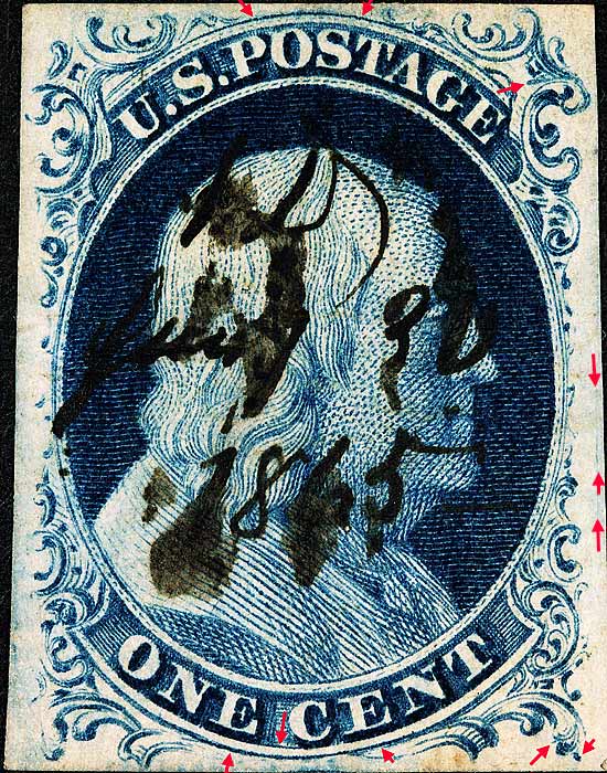 | Scott #9 Blue, Relief B Type IV Issued both imperforate and perforated. Perforated copys are more scarce. DOUBLE TRANSFER |