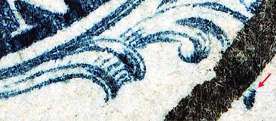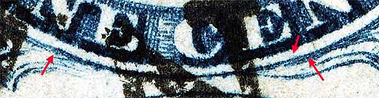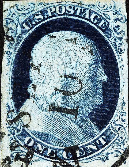 | Scott #9 Blue, Relief B Type IV Issued both imperforate and perforated. Perforated copies are more scarce. DOUBLE TRANSFER The double transfer is most noticeable on early impressions in the left side Ornaments. |