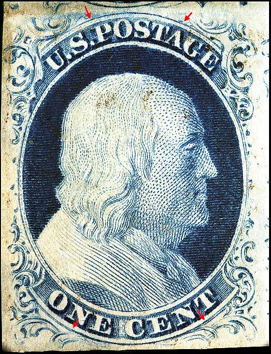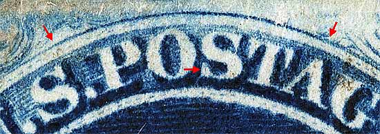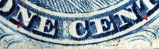 | Figure 1. (Below) Detail of the TOP RECUT LINE. The recut line extends closer to the S of US than illustrated in the Ashbrook plating diagrams. The plating diagrams also illustrate a plating mark in the "S" of POSTAGE.