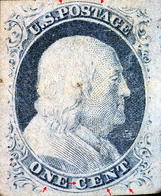 | Scott #9 Blue, Type IV, Relief A Issued both imperforate and perforated. Perforated copies are more scarce. SPLIT TOP LINE Courtesy of Dennis Rice |