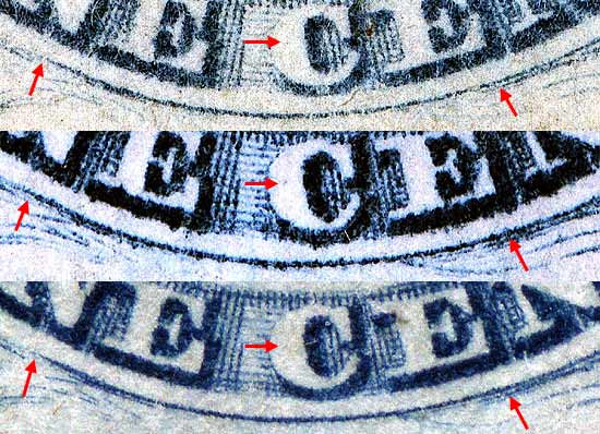 | Figure 3. (Below) Detail view of a helpful heavy mark in the lower right scroll. Not a plating mark in the traditional sense, as many Position