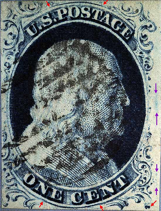 | Scott #9 Blue, Type IV, Relief B Issued both imperforate and perforated. Perforated copys are more scarce. SINGLE RECUT TOP, |