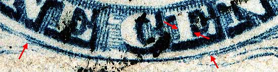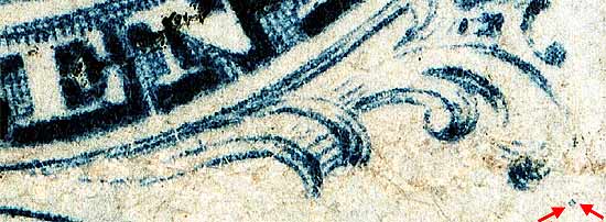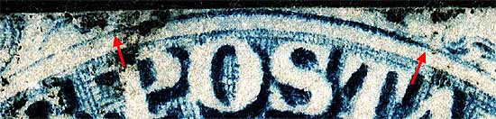 | Figure 3. (Below) Small dot of color below the plume remains. The 10th vertical row of "B" reliefs do not have GUIDE DOTS, so this is technically a plating mark.