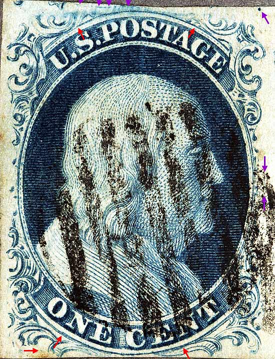 | Scott #9 Blue, Type IV, Relief A Issued both imperforate and perforated. Perforated copies are more scarce. SPLIT TOP LINE This is part of a horizontal strip of 2. See 54R1L The GUIDE DOT seen at the upper right is part of 43R1L. |