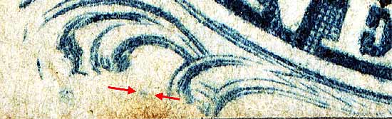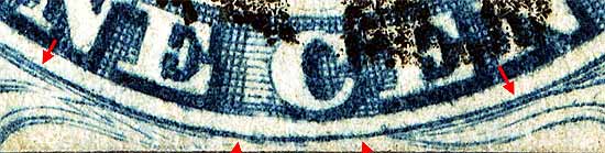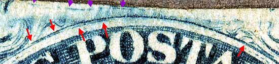 | Figure 1. (BELOW). Detail view of TOP RECUT LINE. The recut line does not follow the original design, hence the SPLIT TOP LINE variety. The spot of color above ornament X is a plating mark from 43R1L, and is shown in Neinken and Ashbrook. The line of color across the top is, at this time, is not known if consistent.