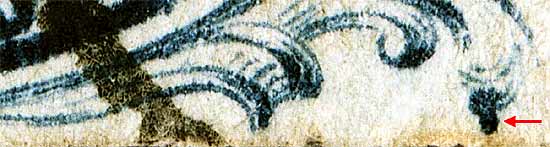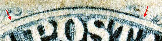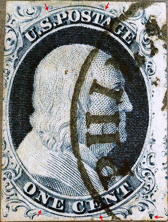 | Figure 3. (Below) Red arrow indicates GUIDE DOT. The unusual shape and location of the GUIDE DOT helps ascertain this stamps position. Ashbrook classifies this teardrop shaped GUIDE DOT as Class C. (See Neinken or Ashbrook)
