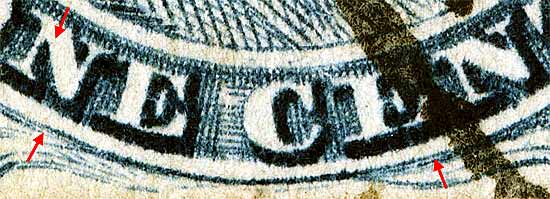 | Figure 2. (Left) Detail of BOTTOM RECUT line. Plating mark in the "N" of ONE only shows on early impressions.