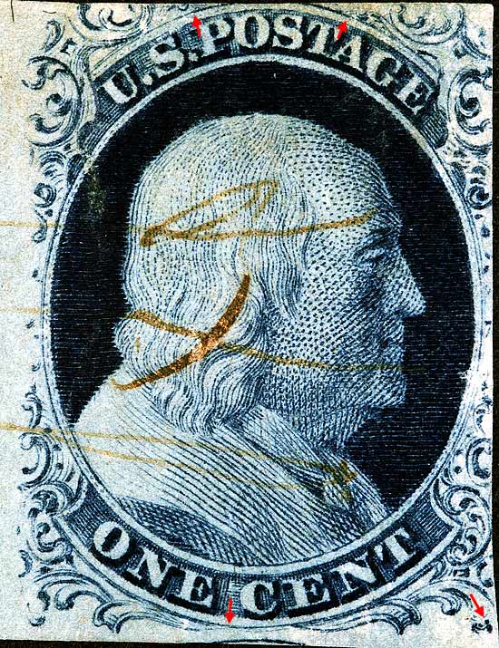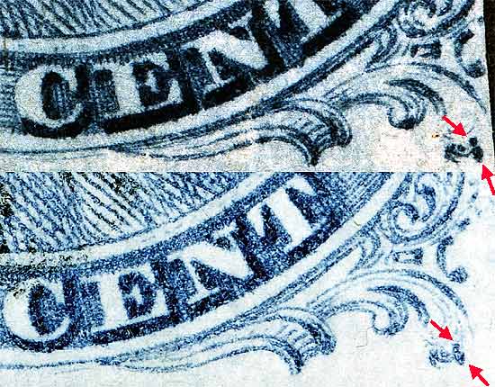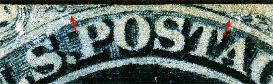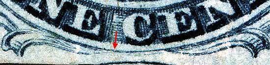 | Figure 3. (Below) GUIDE DOT location. The location of the GUIDE DOT helps ascertain this stamps position. Ashbrook classifies this GUIDE DOT as Class K. (See Neinken or Ashbrook)