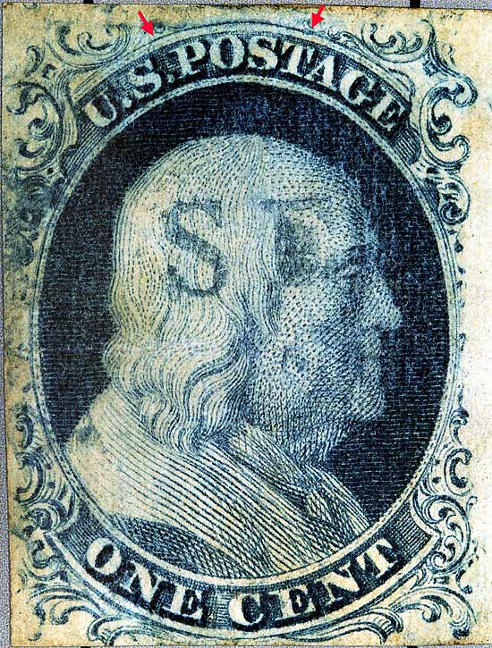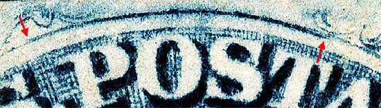 | Figure 2. (BELOW). Detail view of TOP RECUT LINE. The recut line does not follow the original design. The right end drops below the original line as noted in Neinken. The left end of the recut appears to be split and above original line, ending between the S of US and P of POSTAGE. This position is not classified by Neinken or Ashbrook as a SPLIT TOP LINE variety.