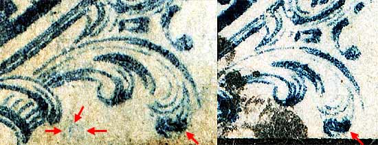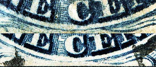 | Figure 3. (Below) Detail view of bottom curved line on 2 impressions. The bottom line was NOT recut. The weak bottom line appears to have either broken or wore away in the lower image. This characteristic is similar to the famous 89R1L but is not discussed in much detail. Earl B. Oakley illustrates in The Chronicle of the US Classic Issues, Issue 58, May 1968 that the bottom lines of Positions 30L, 50L, 67R and 90R and 99R1L also wear away on late impressions.