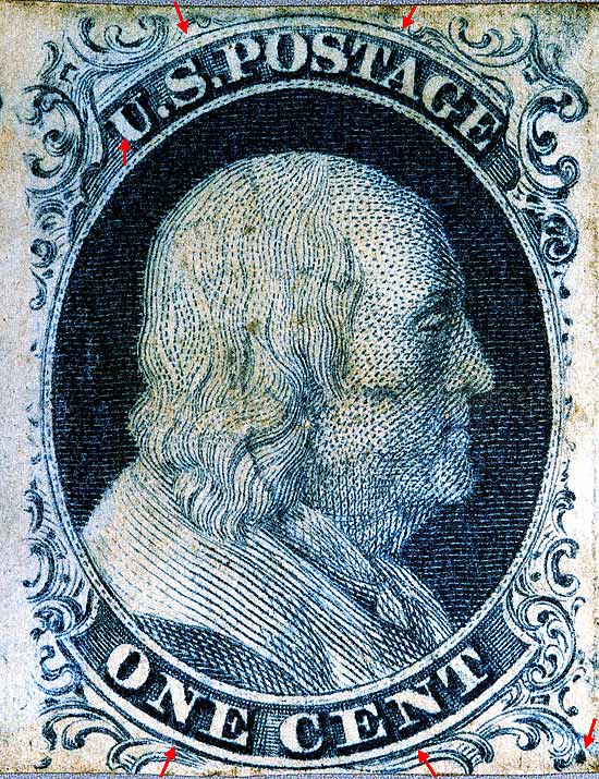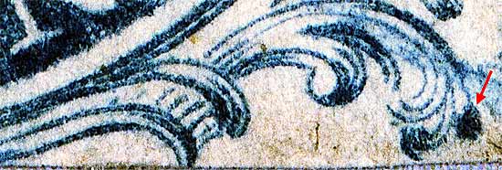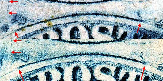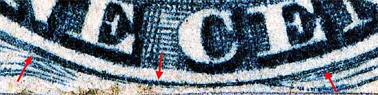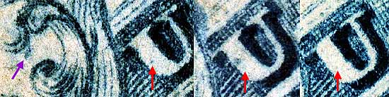 | Figure 4. (BELOW). Detail view of plating mark in the U of US. A blur of color below Ornament "A" may only be present on very early impressions.