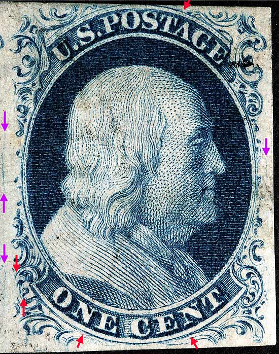 | Scott #9 Blue, Type IV, Relief A Issued both imperforate and perforated. Perforated copys are more scarce. SINGLE RECUT TOP, NOTE: The left end of the top recut extends farther to the left than illustrated in the plating diagrams. The diagrams also indicate the upper left ornaments are double transfered or shifted slightly. This most likely reveals itself best on early sharp impressions. |