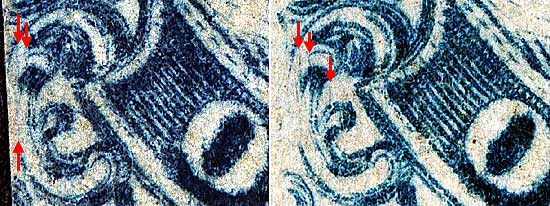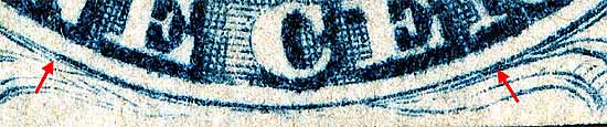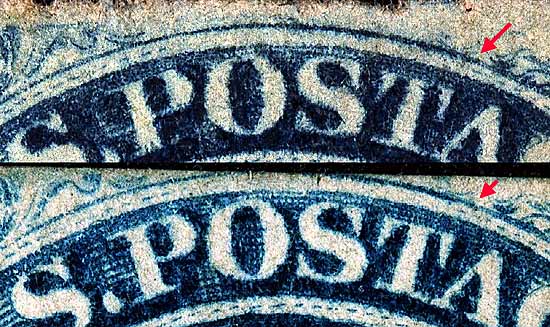 | Figure 1. (Below) Detail of TOP RECUT Line. The Ashbrook plating diagrams illustrates the left end of the recut line stopping at serif of P. Close examination reveals it extends farther than illustrated.