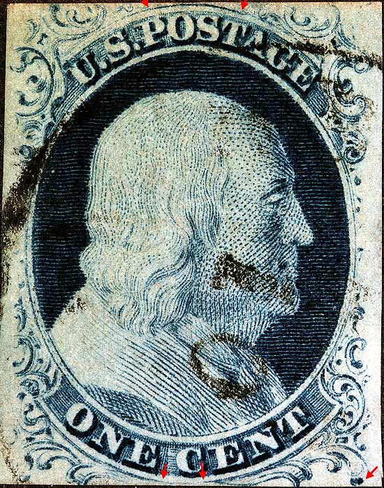 | Scott #9 Blue, Relief B Type IV Issued both imperforate and perforated. Perforated copys are more scarce. SINGLE RECUT TOP ONLY The top curved line, only, was recut once. The bottom line was not recut. On earlier impressions the bottom line was weak, but complete. Over time, the bottom line broke or wore away substantially, to well over 2mm in 1857 printings as shown below. |