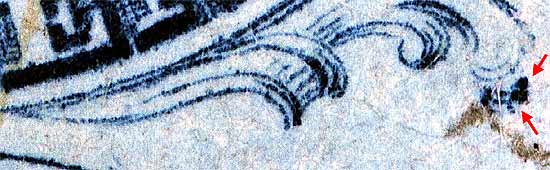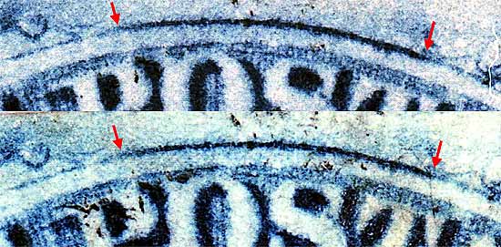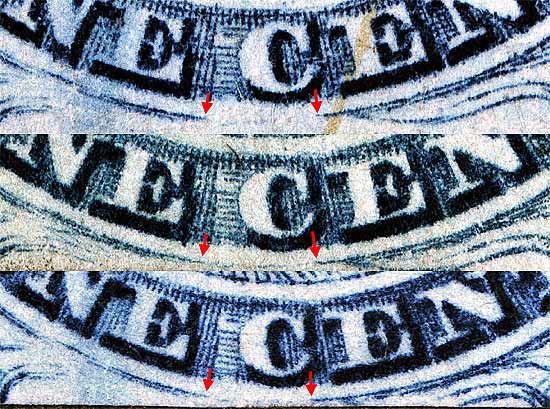 | Figure 2. (Below) Detail view of bottom curved line on 3 impressions. The bottom line was NOT recut. The weak bottom line appears to have either broken or wore away in the lower image. This feature makes 89R1L famous but it is not the only position to have this characteristic. Earl B. Oakley illustrates in The Chronicle of the US Classic Issues, Issue 58, May 1968 that the bottom lines of Positions 30L, 50L, 67R and 90R and 99R1L also wear away on late impressions.