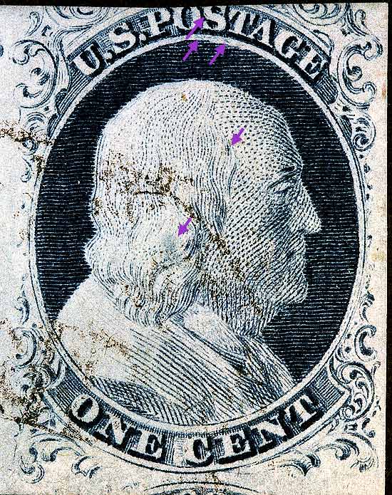 | Scott #9, Blue, Type IV, Relief T Issued both imperforate and perforated. Perforated copies are more scarce. DOUBLE TRANSFER, Only positions 2, 3, 8 and, 10 of the RIGHT pane have DOUBLE RECUT bottom curved lines. This can be an aid to plating top row positions of this pane. Part of 7R1L and 8R1L pair. The violet arrows are marks of note not indicated on the Ashbrook diagrams. |