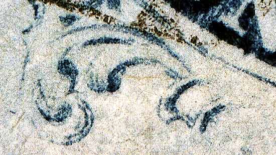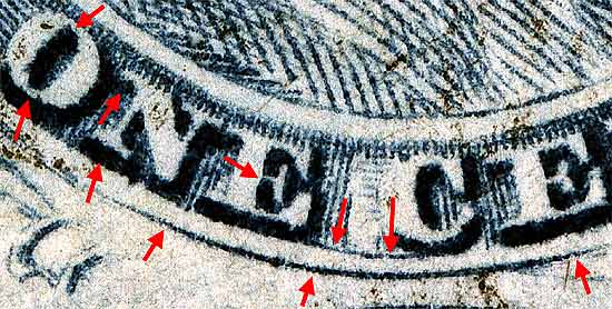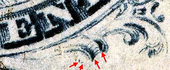 | Figure 2. Detail view of plating marks in the lower right quadrant of this position. The remains of the right scroll ball and plume can be seen.