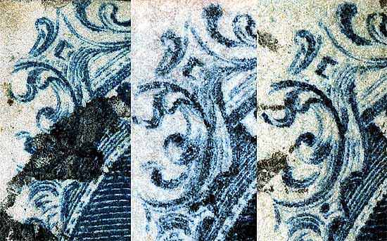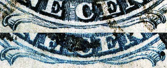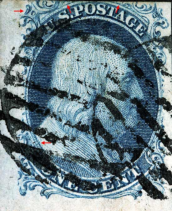| Scott #9 Blue, Type IV, Relief B Issued both imperforate and perforated. Perforated copys are more scarce. SINGLE RECUT TOP ONLY Ashbrook and Neinken both do not classify this position as a DOUBLE TRANSFER or show in the plating diagrams that it is shifted. The doubling of lines can be found all long the the left Ornaments particularly on earlier impressions. The plating diagrams only show the top recut line which makes plating singles a bit more difficult. Please see Figure 4 to examine a new plating mark, east of Ornament F/G. The Archivist would like to hear from other students of this issue confirming this mark. |