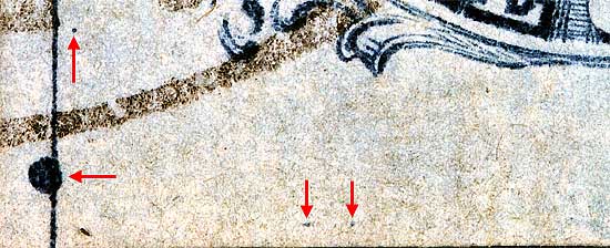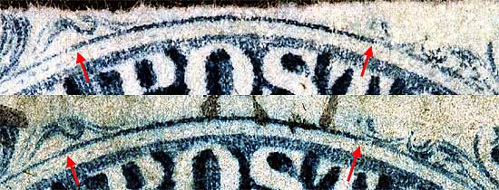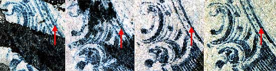 | Figure 4. (Below) A new plating mark, east of Ornament F/G, in the shoulder oval can be seen fading away as the the plate wears.