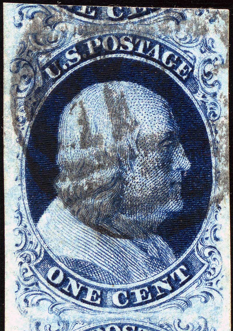 | Blue, Type II, Relief A Issued only imperforate. PLATING NOTES: Vertical pair 18L3-28L3. Figure 1. (Below) Courtesy of Richard Celler. |