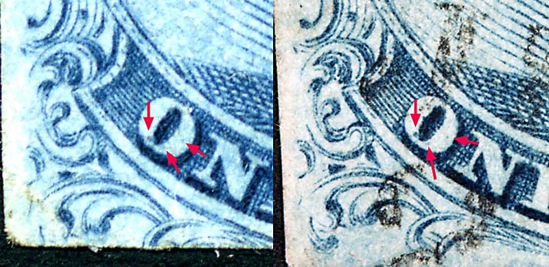 | Figure 3. (Below) A heavy dot plating mark in the lower left quadrant in the O of ONE, Additionally there are two other weaker dots in the lower right quadrant of the O of ONE.