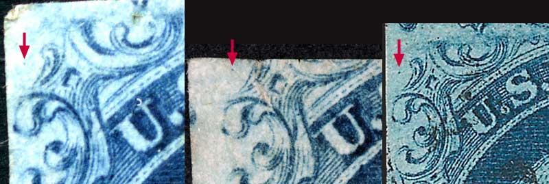 | Blue, Type II, Relief A Issued only imperforate. PLATING NOTES: The plating diagram shown in Neinken as position 19L3 (page 237) is incorrect and is really Position 58L3. Ornaments L, M and N are very short. Ornaments A and B are complete. Ornament R appears weak. There is also a faint blurry horizontal line under the left scroll. (Not shown) The right plume is weak internally. Figure 1. (Below) This image below is part of a horizontal pair, 19L3 and 20L3. |