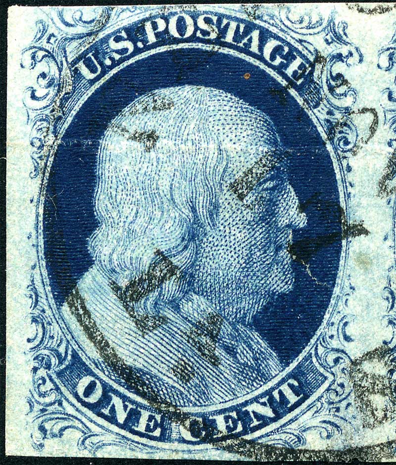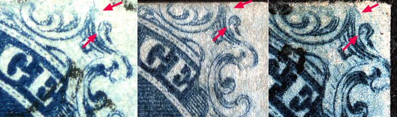 | Blue, Type II, Relief A Issued only imperforate. PLATING NOTES: The Neinken plating diagram for 58L3 indicates that this position has no plating marks. The plating diagram shown in Neinken as 19L3 (page 237) is really Position 58L3. Ornaments P, Q, F, and G are short. Ornaments A, B and M are complete. There are inconsistant plate scratches at the upper left corner. The lower portion of Ornament L appears crushed. |