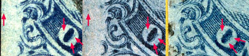| Figure 2. (Below) Red arrows indicate plating marks as shown in the Neinken plating diagrams for Position 19L3. There is also a consistant dot to the left of Ornament G/H.