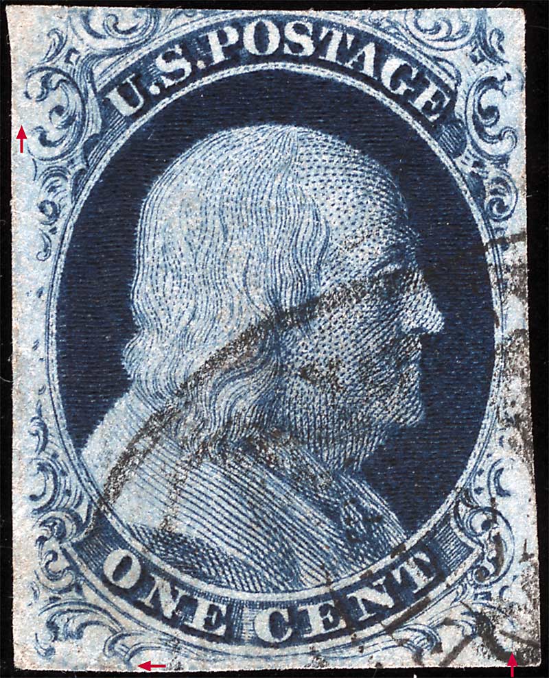 | Scott #7 Blue, Type II, Relief A Issued only imperforate. PLATING NOTES: The Neinken plating diagram for 59L3 indicates that this position has no plating marks. The plating diagram is incorrect. Figure 1. (Below) Position 59L3. Courtesy of Jason Thompson |
