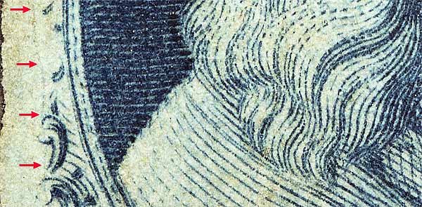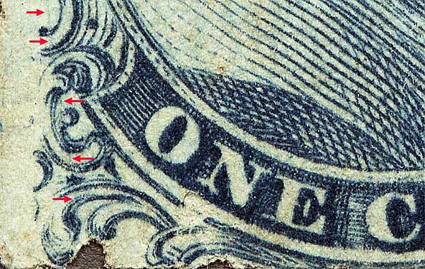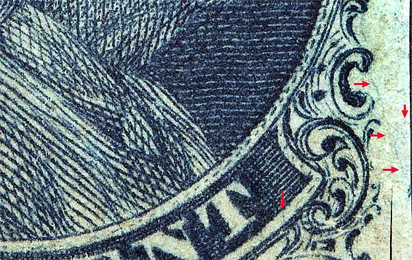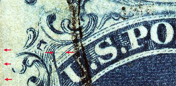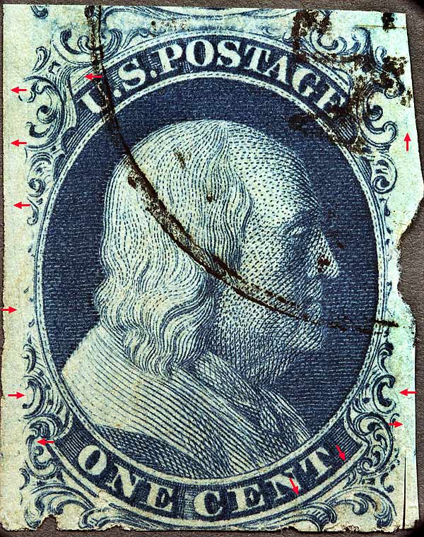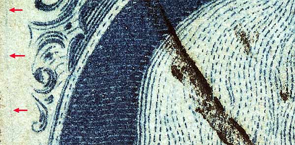 | Scott #7 Blue, Type II, Relief B Issued only imperforate. NOTES: This position was plated against the "Warner Strip" as illustrated in Neinken on pp 225. |