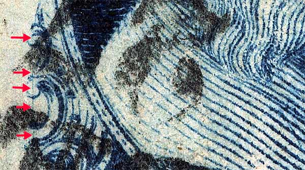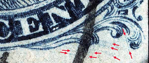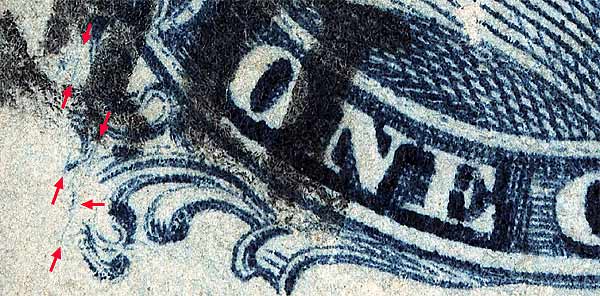| Figure 2. (Below) A diagonal plate scratch or plate crack cutting across the lower left plume remains as illustrated in the Neinken plating diagrams. The other scratches or cracks are not illustrated in the diagrams but have been confirmed from Ashbrook reference photographs. Neinken illustrates numerous plating marks in the O and N of ONE. Most of the plating for Plate 3 was accomplished from black and white photographs and it is suspected that these marks are actually cancel ink. To confirm if a marking is constant, at least two copies of a position are needed.