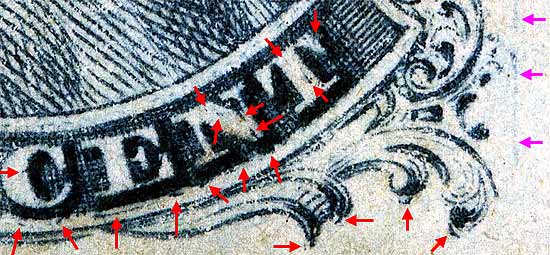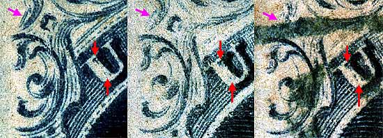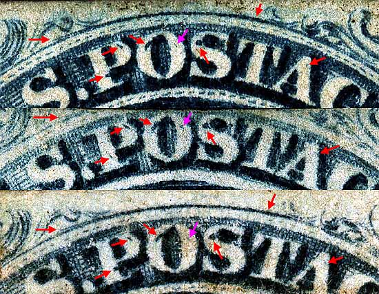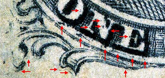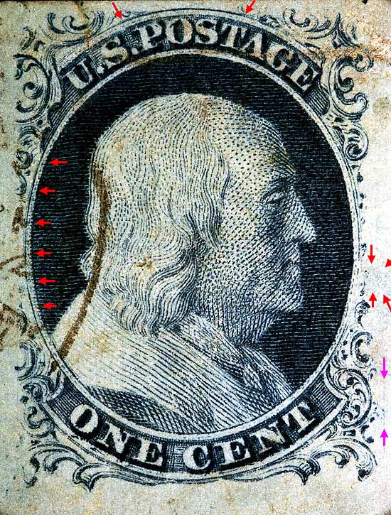 | Figure 1. (Below) Plating marks caused by the double transfer in POSTAGE per the Ashbrook plating diagrams.